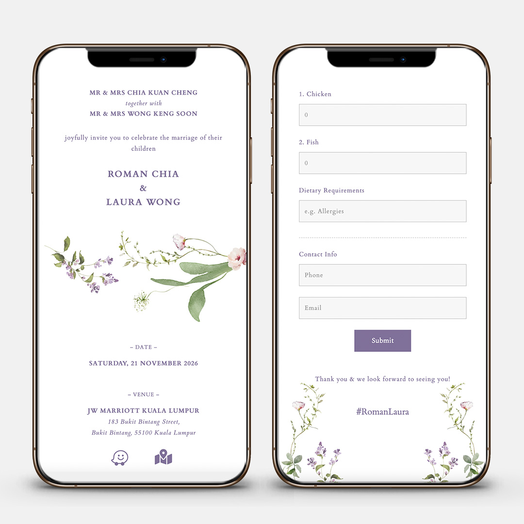 Step 4: You can start to send out the wedding website link to your guests by e-mail, WhatsApp, or text and they can RSVP online. Once a guest RSVPs you will receive an email notification and you will be able to view all the responses in real-time personal Google Sheet.